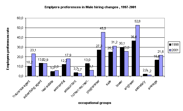 A research carried out in 1997 through 2001showed that up to 30% of vacancy advertisements were not genderwise neutral.15 At that this did not concern the occupations where professional skills connected to the male and female labour force biological differences quality were required. Within four years the share of such advertisements increased to 40%, in spite of the fact that the Russian Law forbids gender discrimination employment. The gender preferences distribution by the occupation groups shows that the employers have stable patterns on male and female occupational preferability.